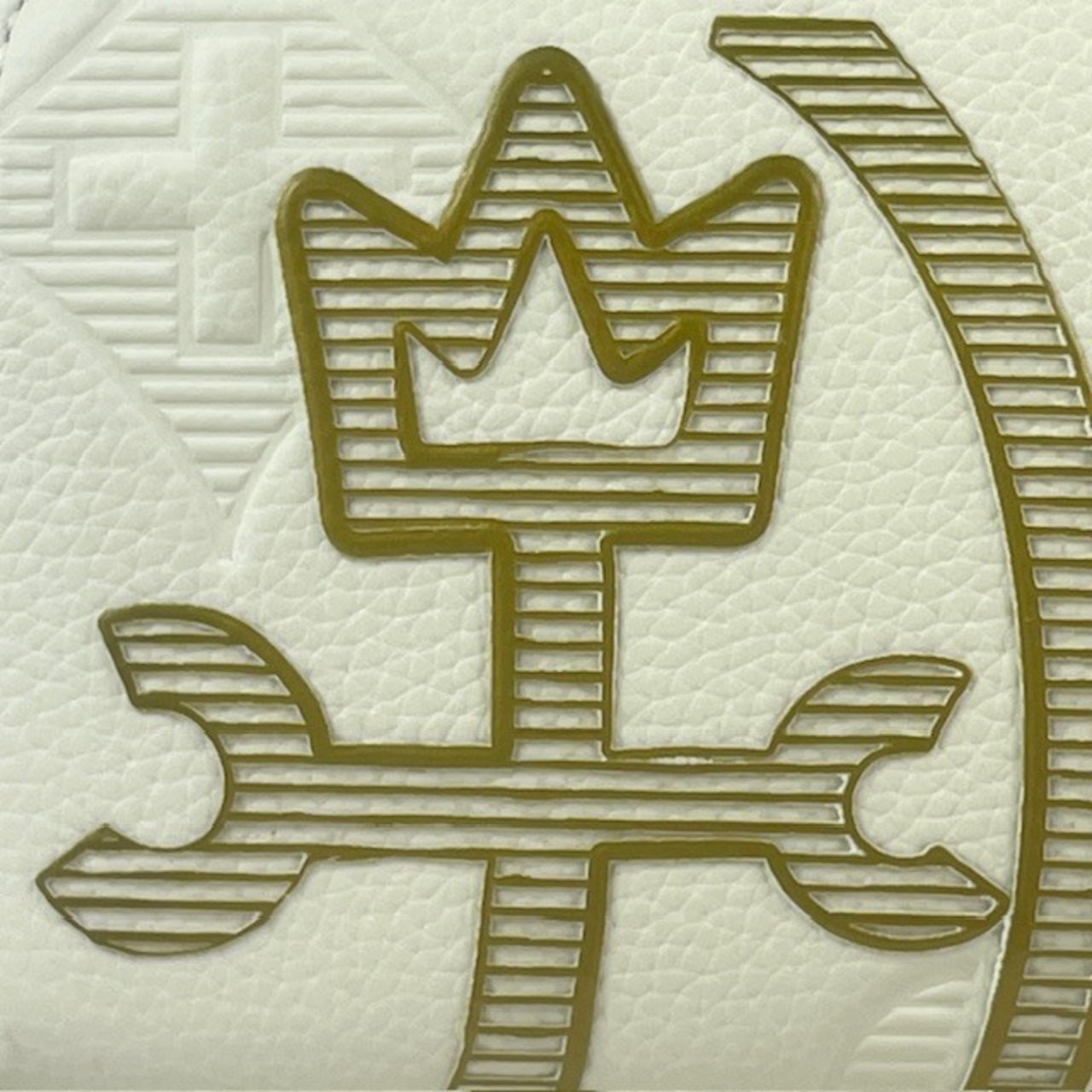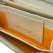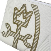 エッジの効かせた線とボーダーラインで新しい印象の家紋表現。エンボスと立体プリントの2つの技法で重なるようにデザインし、奥行を出しています。金具とロゴ表現はゴールドで統一し高級感をプラス。内装生地にはブランドカラーのオレンジを使用。家紋やクロスなどブランドのモチーフを散りばめ、こわだりを感じるデザインです。