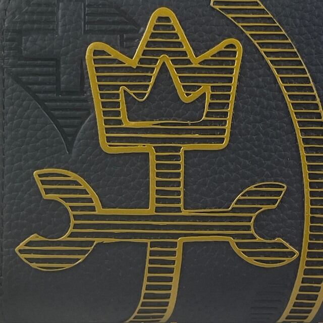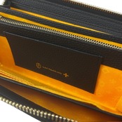 エッジの効かせた線とボーダーラインで新しい印象の家紋表現。エンボスと立体プリントの2つの技法で重なるようにデザインし、奥行を出しています。金具とロゴ表現はゴールドで統一し高級感をプラス。内装生地にはブランドカラーのオレンジを使用。家紋やクロスなどブランドのモチーフを散りばめ、こわだりを感じるデザインです。