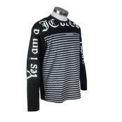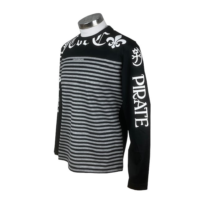 大胆なプリントとボーダー切り替えが目を引く長袖Tシャツ。