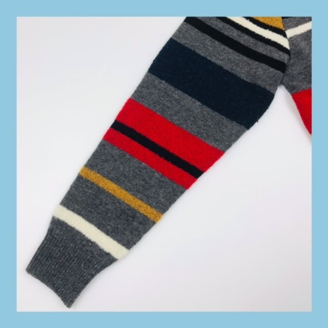 マルチボーダー柄に月桂樹のあしわられたKAMONマーク刺繍やブランドロゴがアクセント。