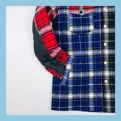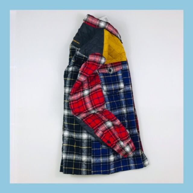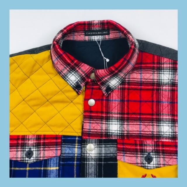 コーデュロイ生地やデニム生地などで切替られたカステルバジャック(CASTELBAJAC)チェック柄中綿キルティングシャツジャケット。