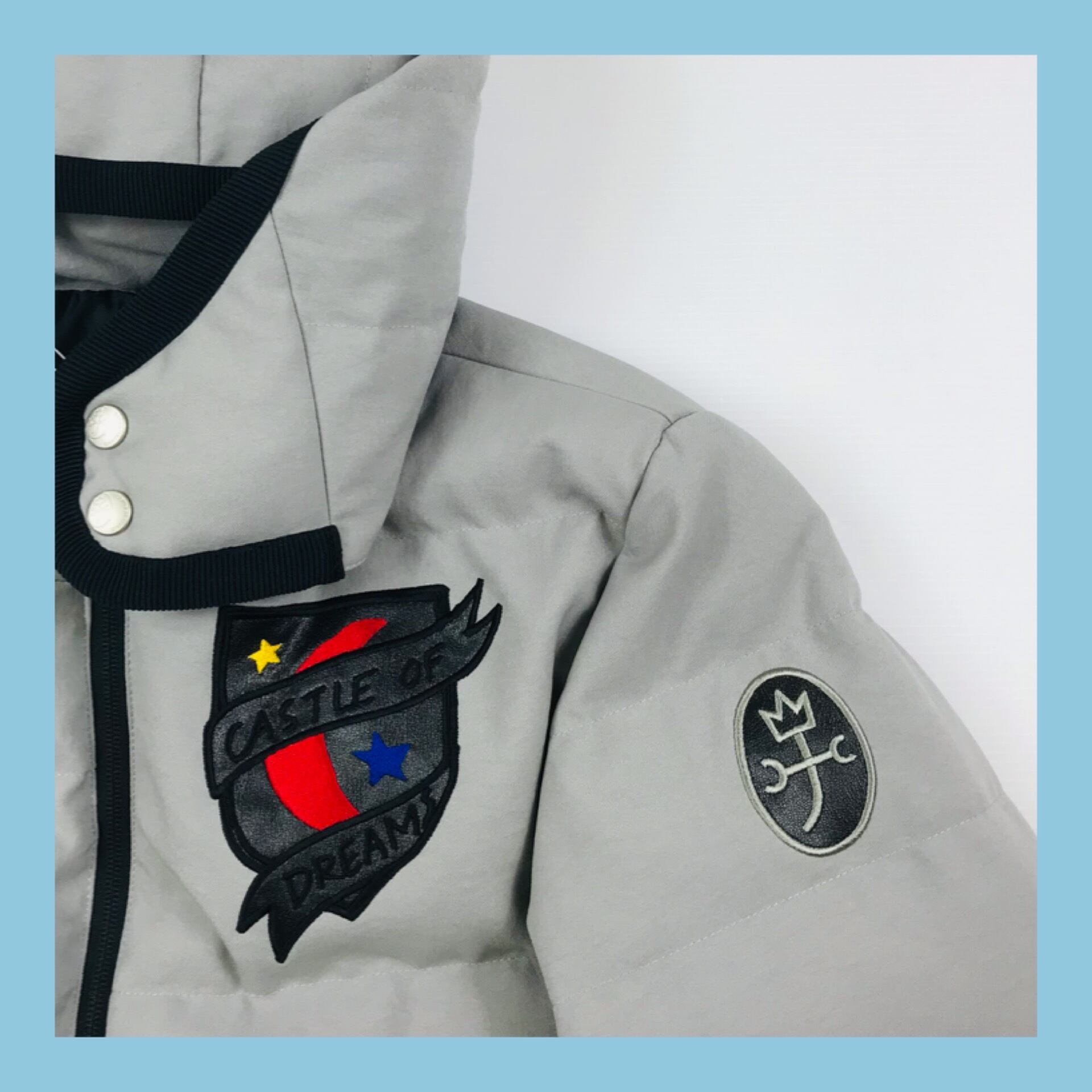 胸の合皮素材のモチーフワッペンがワンポイントアクセント。