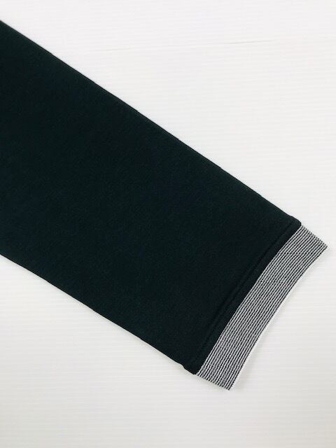 袖口も細かいボーダー柄のリブで切り替え、ほど良くフィットする仕様。 裾両脇スリット入り。