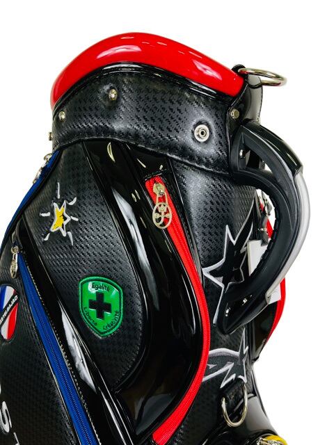 見る角度により美しく光を反射する落ち着いた千鳥格子柄の生地とエナメルを組み合わせた合皮素材を使用したカステルバジャック(CASTELBAJAC)キャディバッグ。