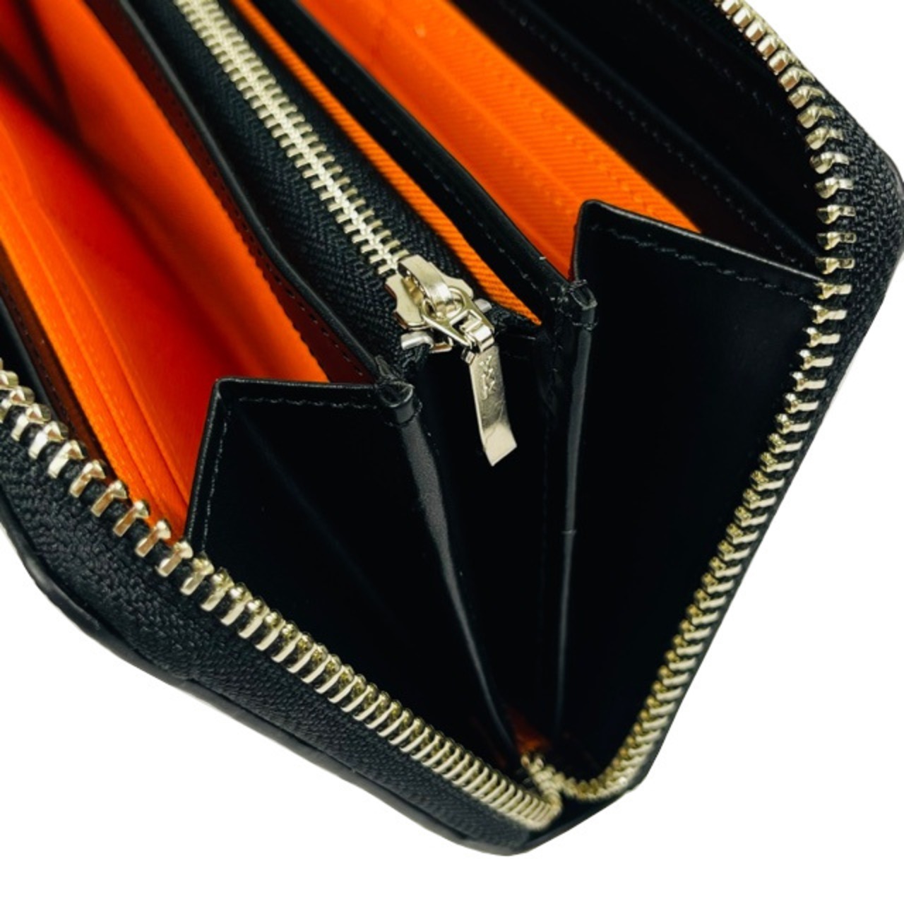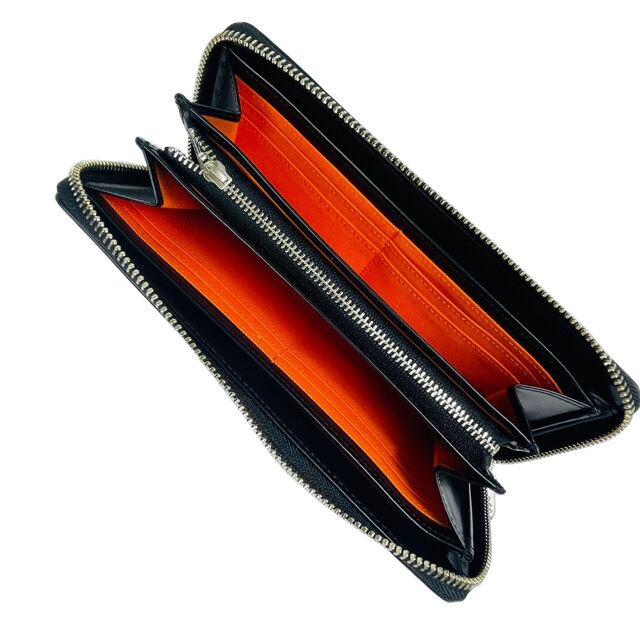 本体内部には2ヵ所の札入れと必要なレシートやポイントカード等を入れるのに便利な差し込みポケットを2ヶ所装備。小銭入れはL字ファスナー仕様で小銭の出し入れがスムーズ。カードは全部で12枚収納可能です。素材は牛革にエンボス加工を施していますのでキズ等が目立ちにくい仕様になっています。