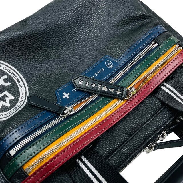 CASTELBAJACを象徴する4原色をファスナーテープとヘリマキでキャッチーに表現。ポイントのファスナーは研磨された美しい光沢感とメタル素材ながら軽く滑らかな動きが特徴です。素材には上質なシュリンク調の合皮を使用。家紋やロゴ等が繊細で立体感ある表現が特徴のシルバー色のシリコンプリントを施しています。ショルダーベルトにもオリジナルのラインテープを使用し、価値を高めています。B5サイズ対応でちょっとしたビジネスシーンやタウンユースに使いやすいサイズ感。ショルダーベルトを取り付けてショルダーバッグとしても使える2WAY仕様。