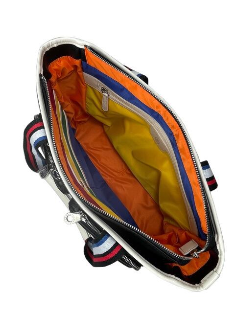 モノトーンでのネーム表現とトリコロールカラーをポイントにしたルックスに内装にはカステルバジャックの4原色を大胆に使用したギャップ感が魅力のカジュアルシリーズ。ファスナー使いやポケットのディティール等でスポーツ・ユニセックス的なテイストを表現。B4サイズ対応で通勤や通学にも使いやすい。ポケットも多く使い勝手の良いアイテム。