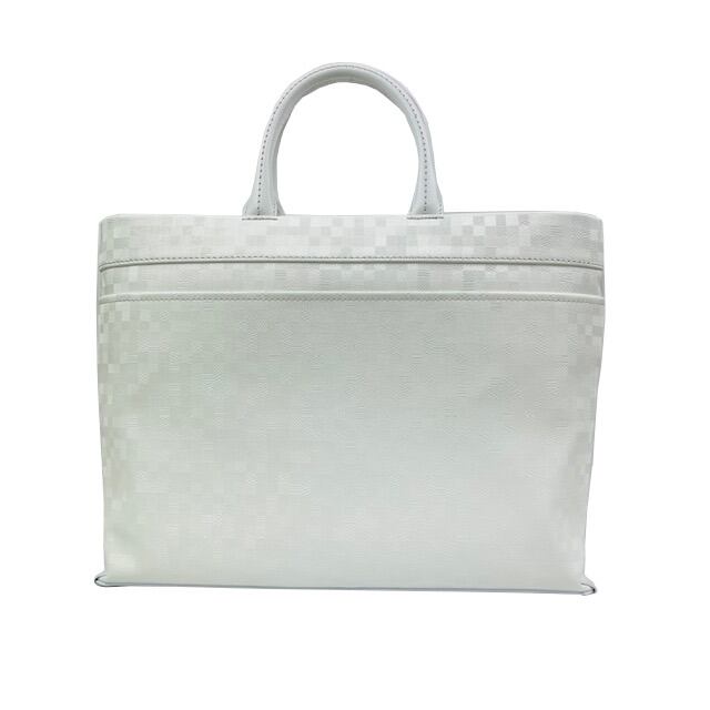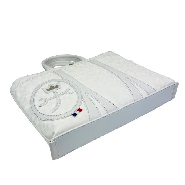 本体生地には角度によってキラキラと光沢を帯びるPVCを採用。付属には牛革を使用。クラウン部分にシルバーの金具を使用した家紋がアクセントに。全面の帯はエッフェル塔をモチーフにし遊び心をプラス。高級感あるオシャレなデザインでイバリの効いたファッションにぴったりなメイドインジャパンのアイテムです。A4サイズがちょうど入る大きさでタウンユースやビジネスユースにも便利。仕分けも行えるポケット配置で使い勝手良さも考慮。