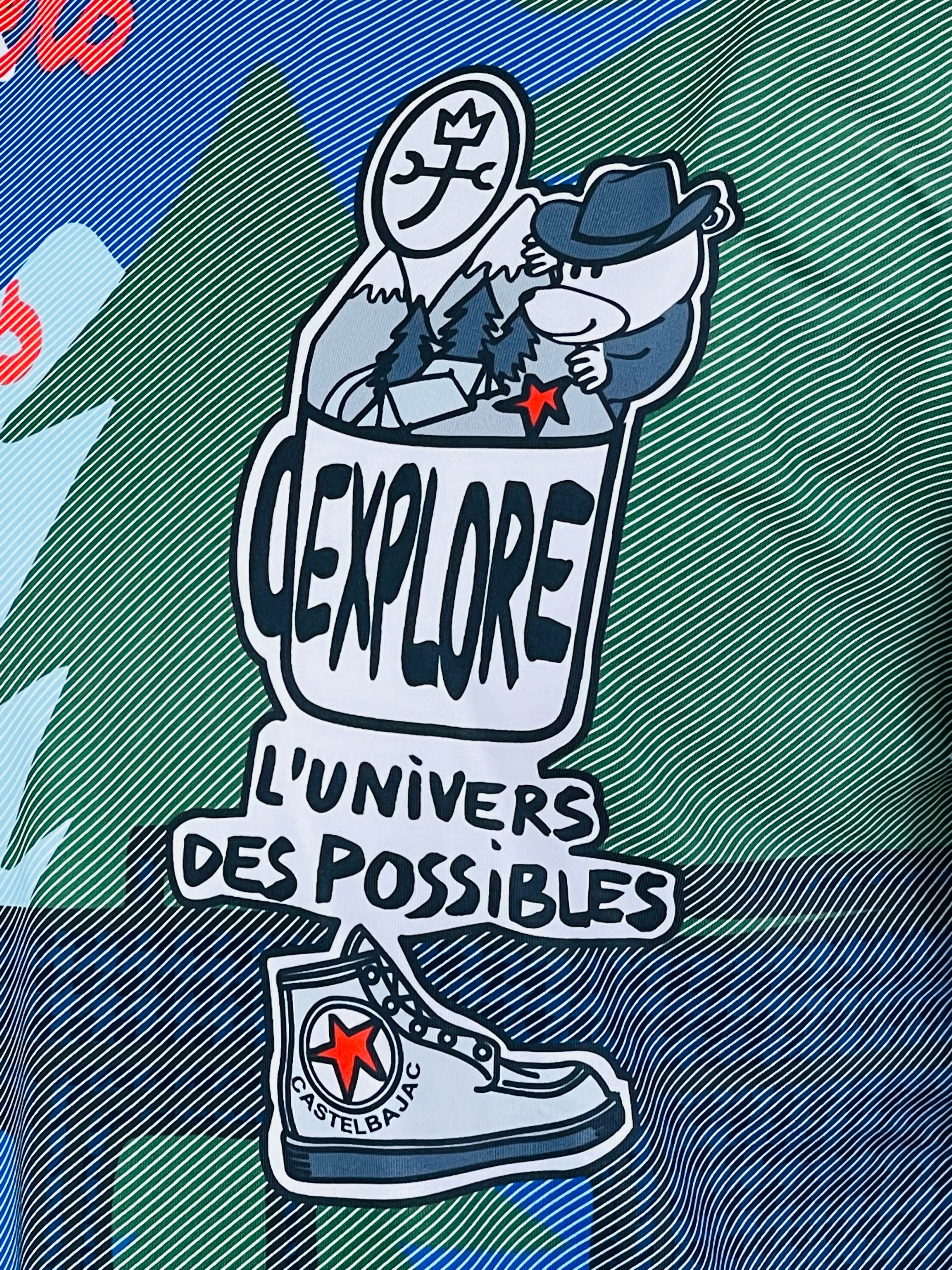 POPでバジャックワールド全開の楽しいデザインです。袖は、さりげなくボーダー切替です。