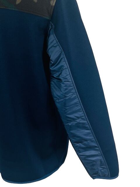 ソフトなツイル素材と薄手の中綿素材、カモフラ柄の起毛素材で切替られた異素材使いハーフジップトレーナー。