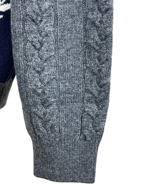 ケーブル編みやKAMONマークのジャガードで切替られたクルーネックセーター。