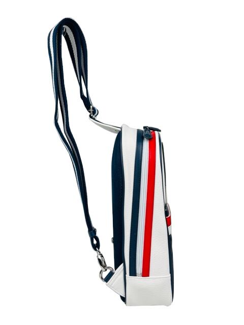 デザイン性と実用性を併せ持つポケットと、トリコロールカラーの大胆な組み合わせがポイントのボディバッグ。
