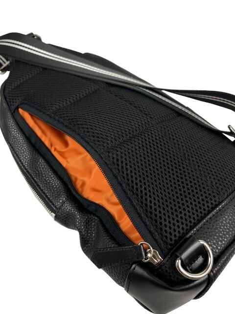 背面はクッション性あるメッシュ素材で背負った際の負担を軽減。底部で金具の付け替えが行えるので左掛け、右掛けどちらにも対応しています。