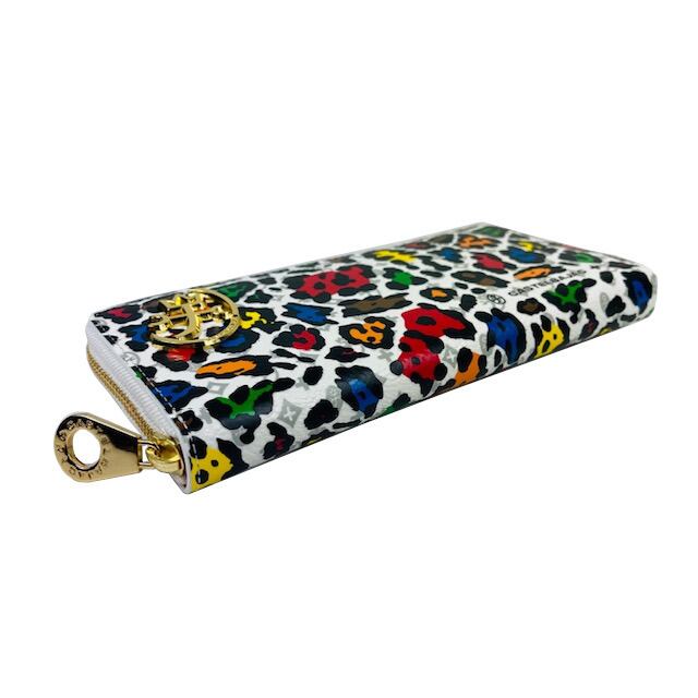 牛革の型押しにカステルバジャックオリジナルのレオパード柄とモノグラム柄を重ねてプリントしたラウンド長財布。インパクトのあるゴールドのKAMONマークがポイント。