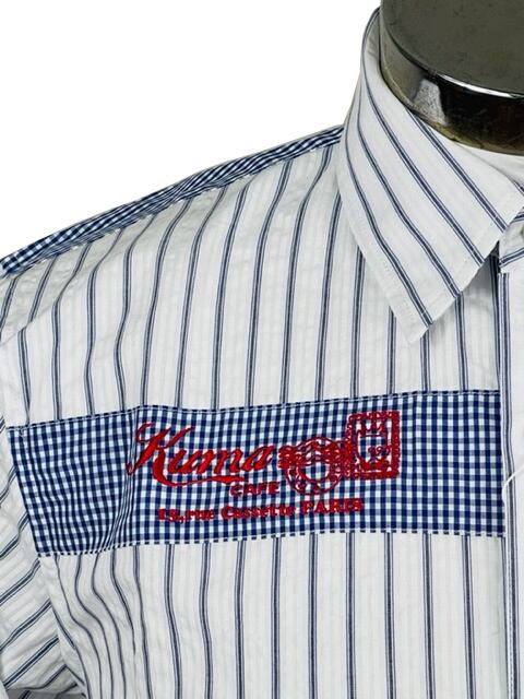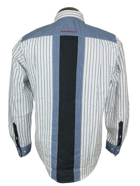 ストライプ、ドット、チェック柄の生地を組み合わせたお洒落なシャツです。