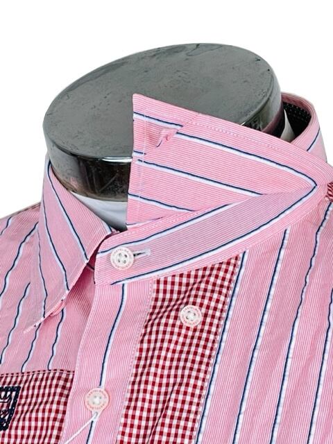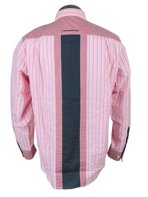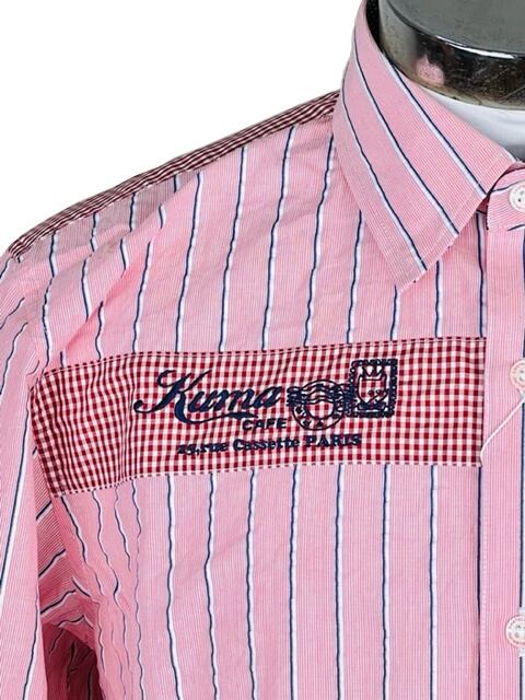 ストライプ、ドット、チェック柄の生地を組み合わせたお洒落なシャツです。