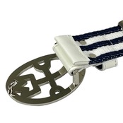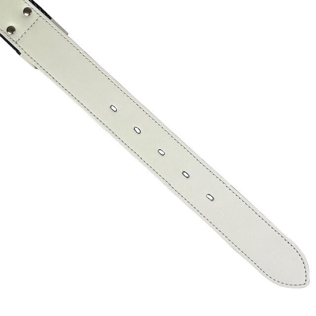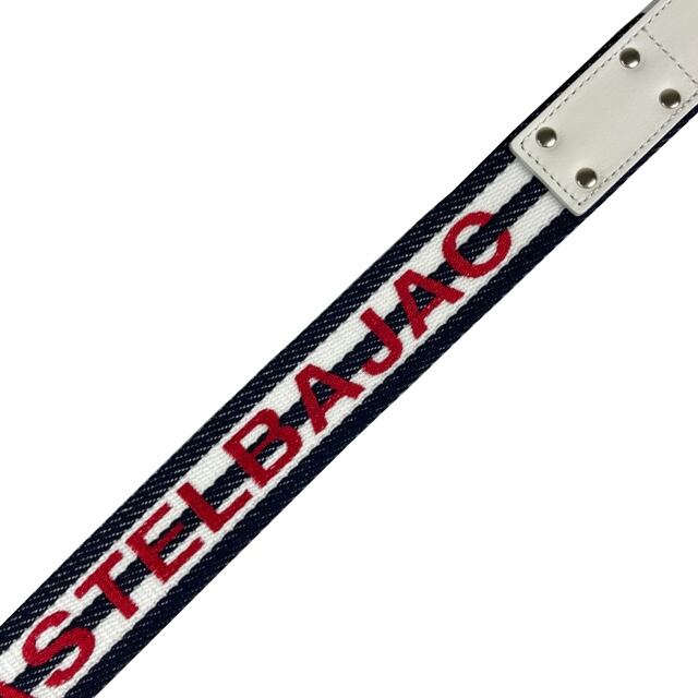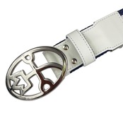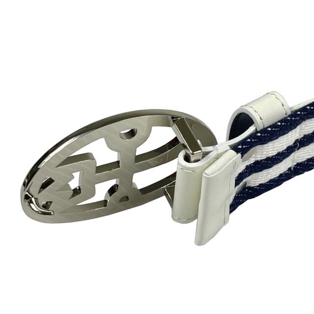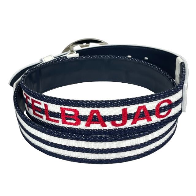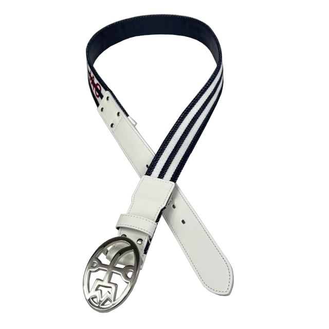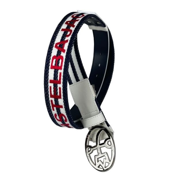 ロゴ刺繍の入ったボーダーデザインに牛革素材を重ねたファッションベルト。