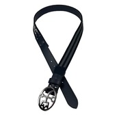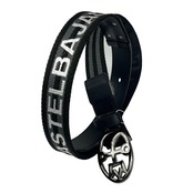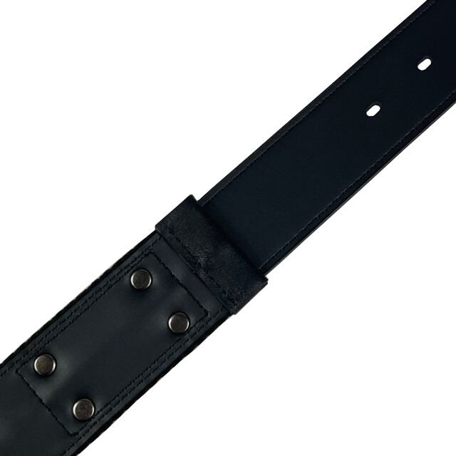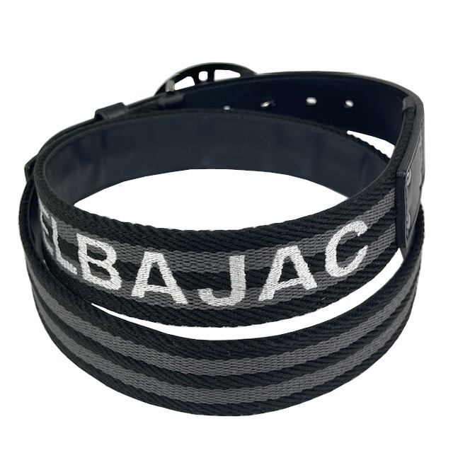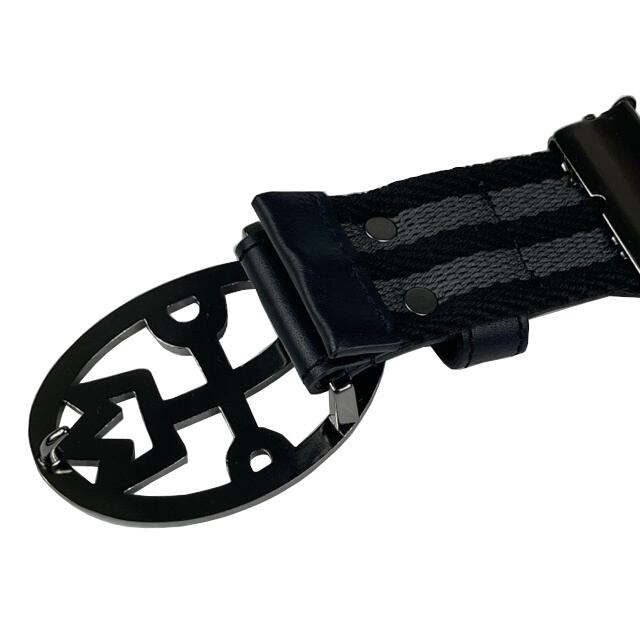 ロゴ刺繍の入ったボーダーデザインに牛革素材を重ねたファッションベルト。