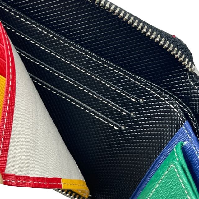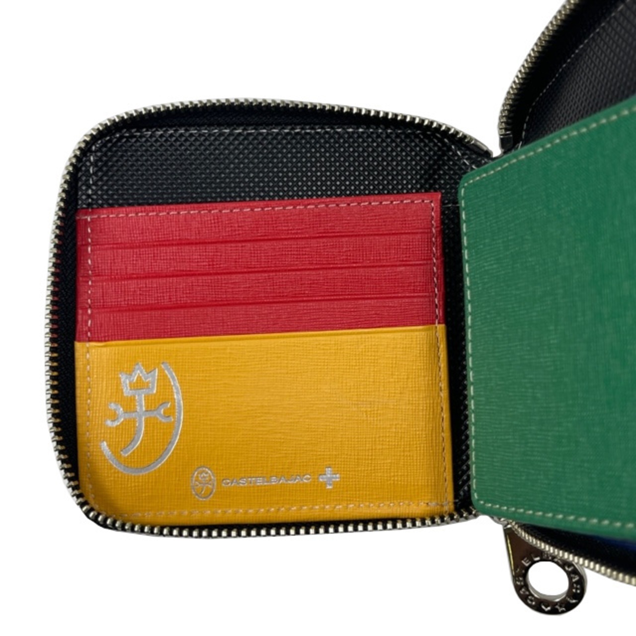 格子柄のエンボス加工を施した牛革を斜めに使用することでダイヤ柄を表現したカステルバジャックらしいPOPな雰囲気の二つ折り財布。