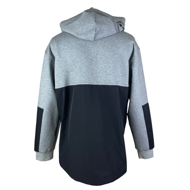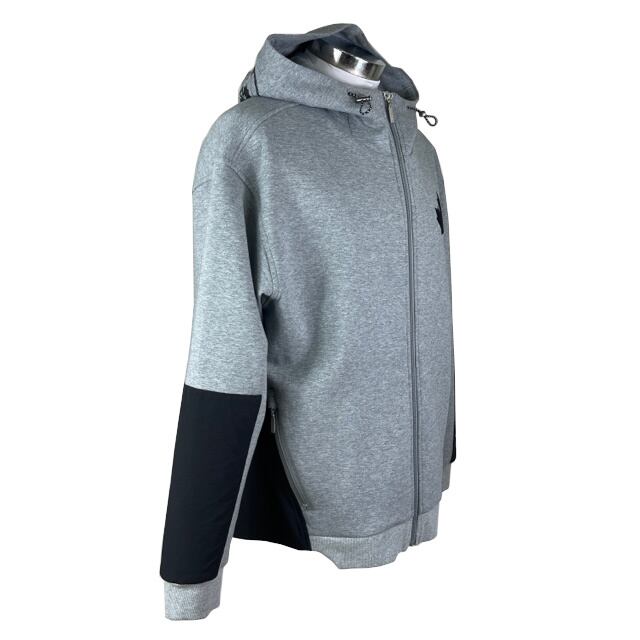 張りのあるやや収縮性のあるソフトなジャージー素材とさらりとしたドライタッチな布帛で切替られたジップアップパーカー。