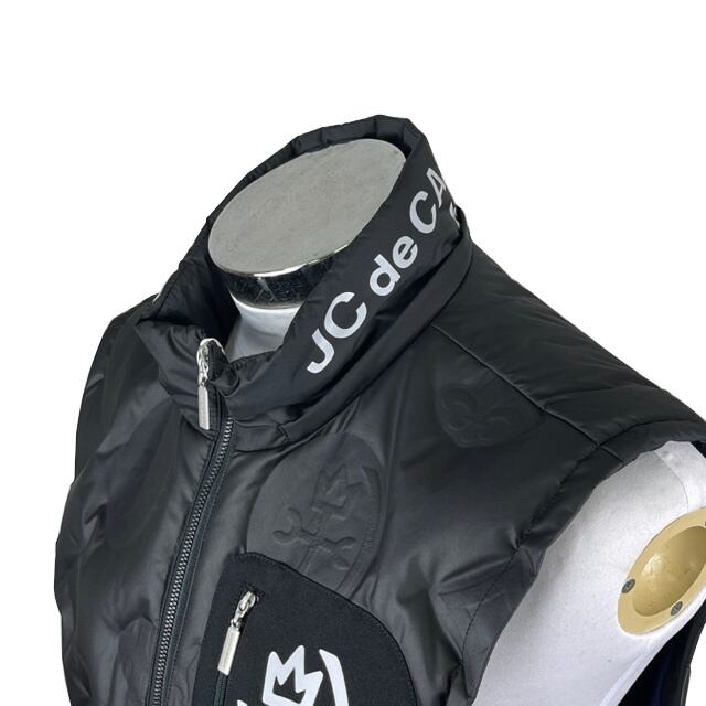 全体にモノグラム柄のエンボス加工された軽くて暖かいダウンベストです。