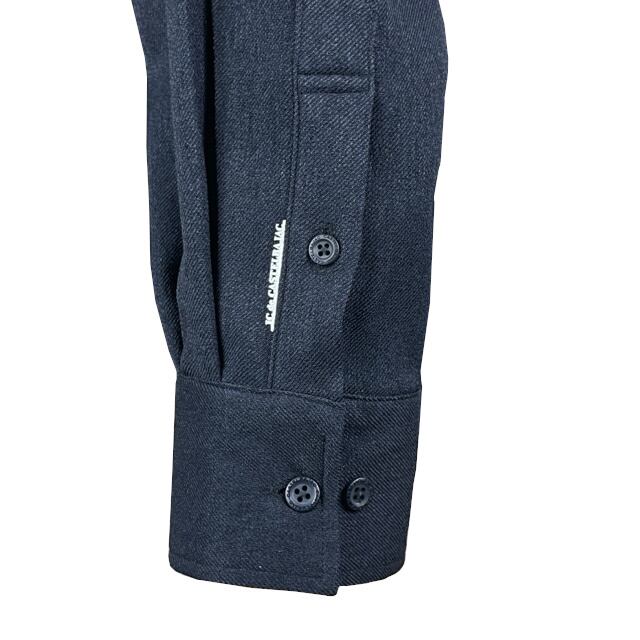 襟の跳ね上げ防止に隠しボタンダウンになっています。