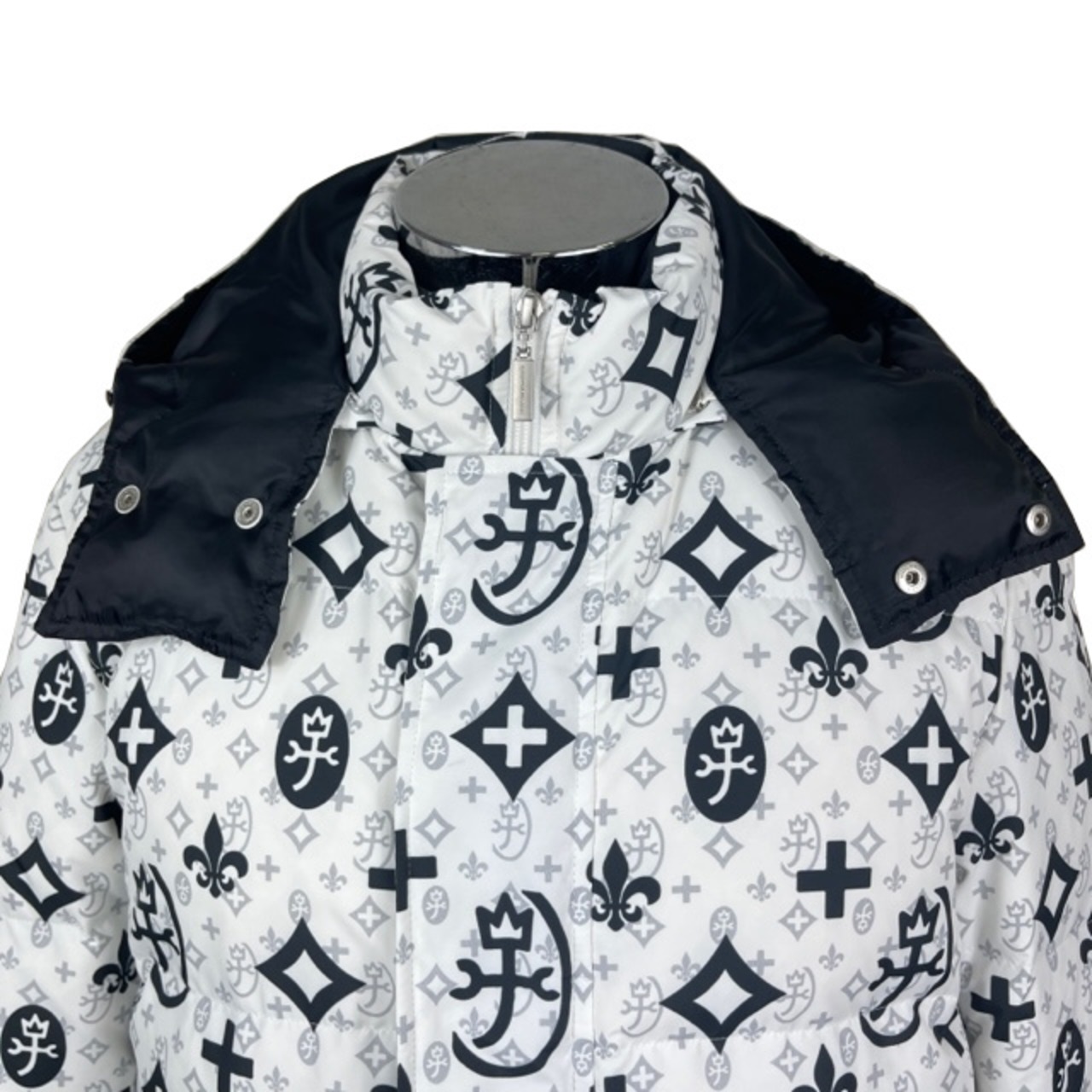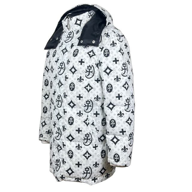 大きさの異なるモノグラム柄をプリントしたインパクトのあるデザインのカステルバジャックダウンハーフコート。