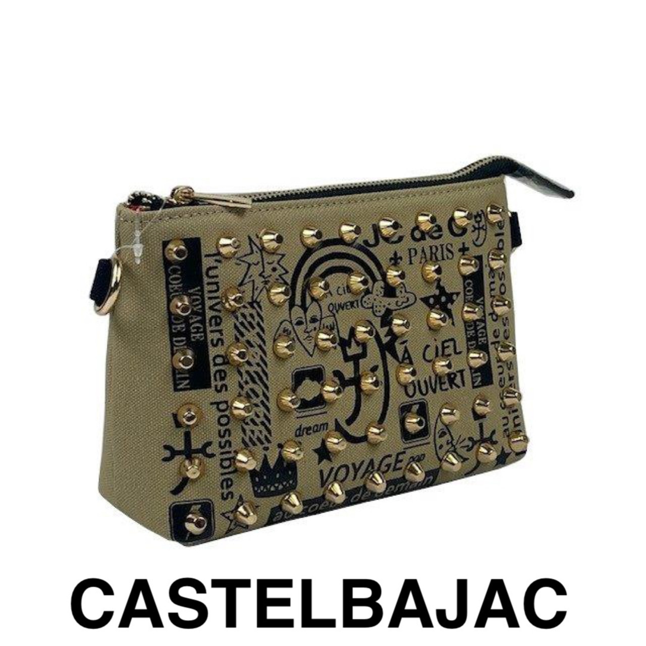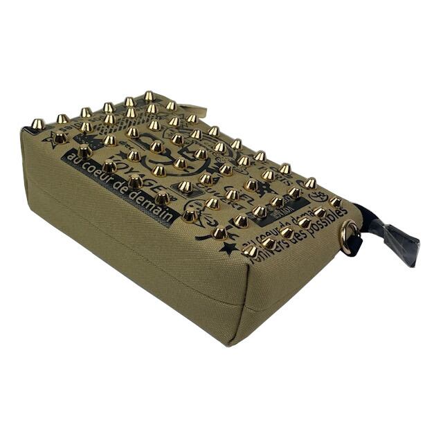 ロゴや家紋等、カステルバジャックのアイコンにスタッズを散りばめたインパクトのあるデザインのミニポーチ。