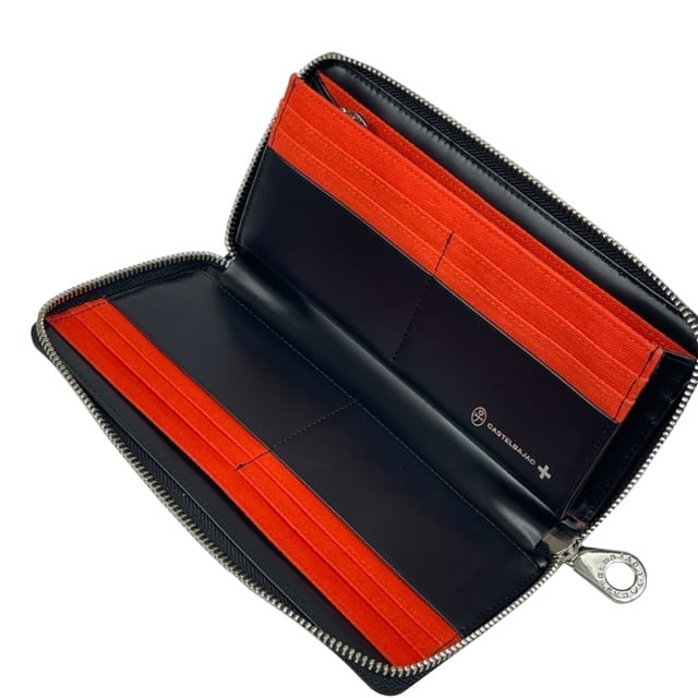 ・フルオープンで大きく開き扱いやすいラウンドファスナー長財布。