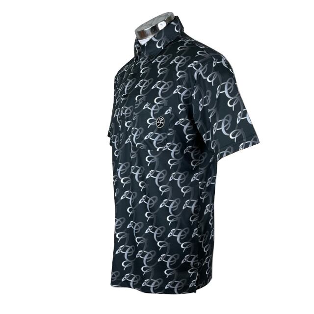 筆記体のイニシャルロゴ総柄の大人の雰囲気がある半袖ポロ。