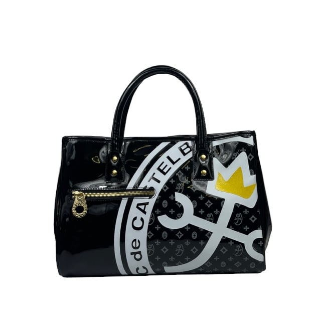 エレガントな印象のエナメル素材に、カステルバジャックのオリジナルプリントが施されたドライビングトート。大きなカモンがポイントで、シンプルなコーディネートにぴったり合います。