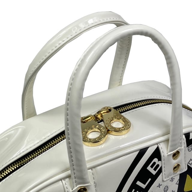 エレガントな印象のエナメル素材に、カステルバジャックのオリジナルプリントが施されたミニボストンバッグ。大きなカモンがポイントで、シンプルなコーディネートにぴったり合います。