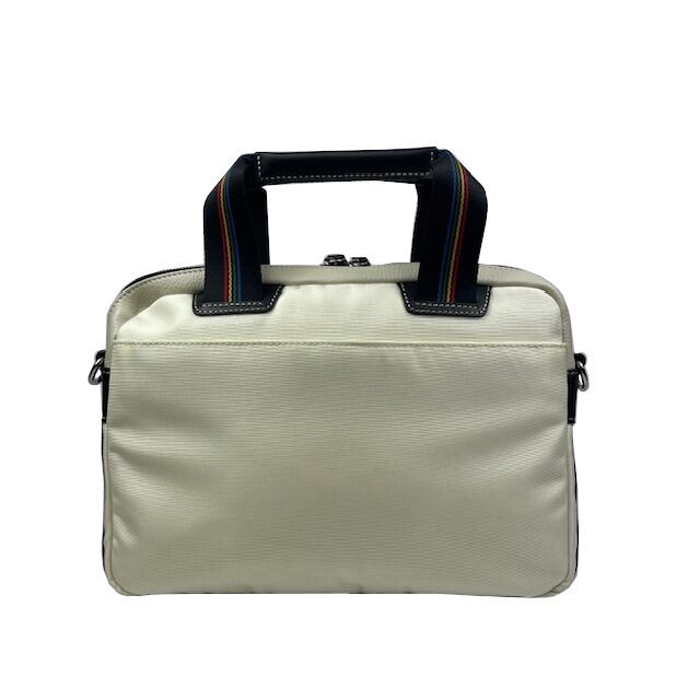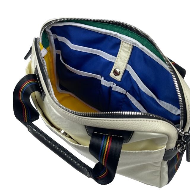ナイロン素材をメインに使用しながらも付属牛革の分量感を多くする事でで1ランク上のカジュアルを提案。くり抜きとメタルパーツのクロスと家紋でブランドを表現。ブランドカラー4色を用いた上品でしっかりとした質感が特徴のテープを採用。内装にもブランドカラーの4色を使用しておりギャップ感を楽しめます。ショルダーバッグとしても使える2WAY仕様。