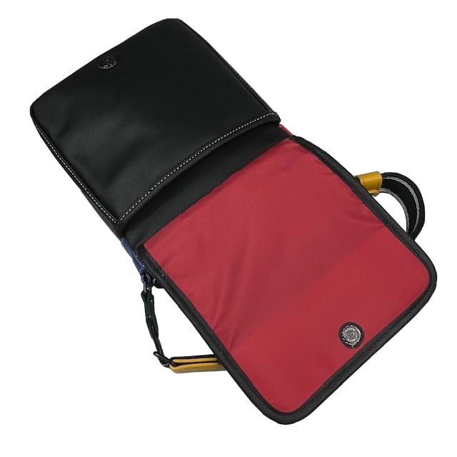 モノトーンカラーの落ち着いた雰囲気にシャープな表現が特徴のシリコンパーツとCASTELBAJACの4原色をポイントで使用しブランドらしい表現を含んだ合皮カジュアルアイテム。