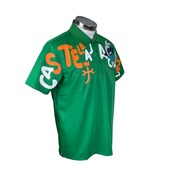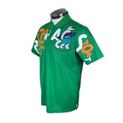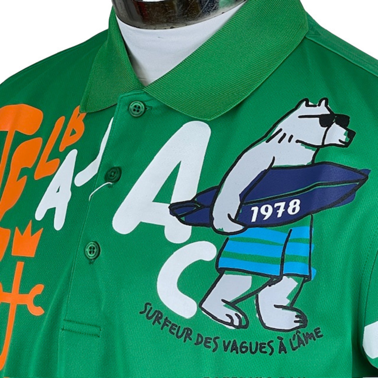 "くまのサーファー”やカラフルなロゴを、袖から身頃にかけてプリントした楽しいデザインの半袖ポロシャツ。