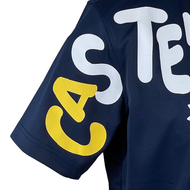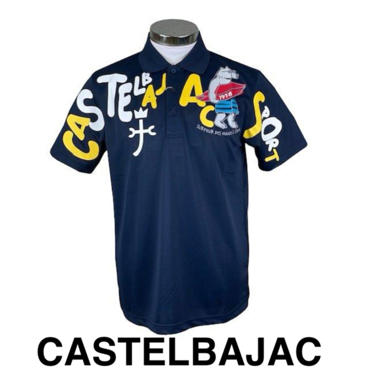 "くまのサーファー”やカラフルなロゴを、袖から身頃にかけてプリントした楽しいデザインの半袖ポロシャツ。