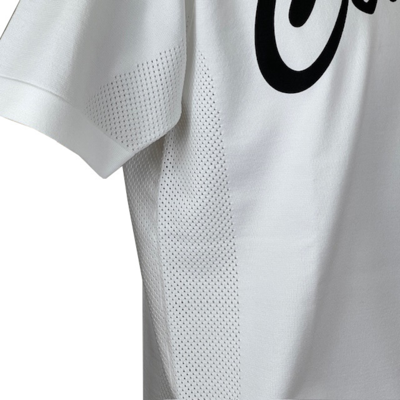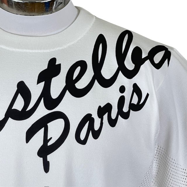 前面から腕、後面までおおきくロゴをプリントしたクルーネックニット半袖Tシャツ。