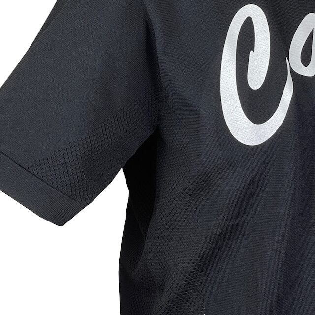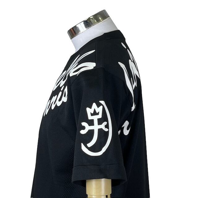 前面から腕、後面までおおきくロゴをプリントしたクルーネックニット半袖Tシャツ。