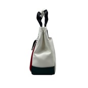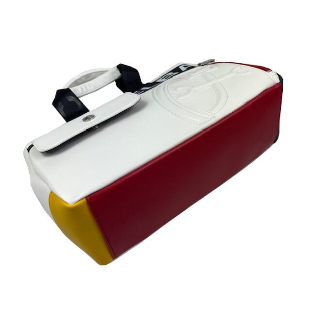 赤色のファスナーや、底面のアカ・グリーン・イエローの鮮やかなブランドカラーがアクセントとなっており、バッグ全体が一層際立つデザイン。