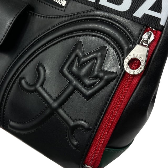 赤色のファスナーや、底面のアカ・グリーン・イエローの鮮やかなブランドカラーがアクセントとなっており、バッグ全体が一層際立つデザイン。