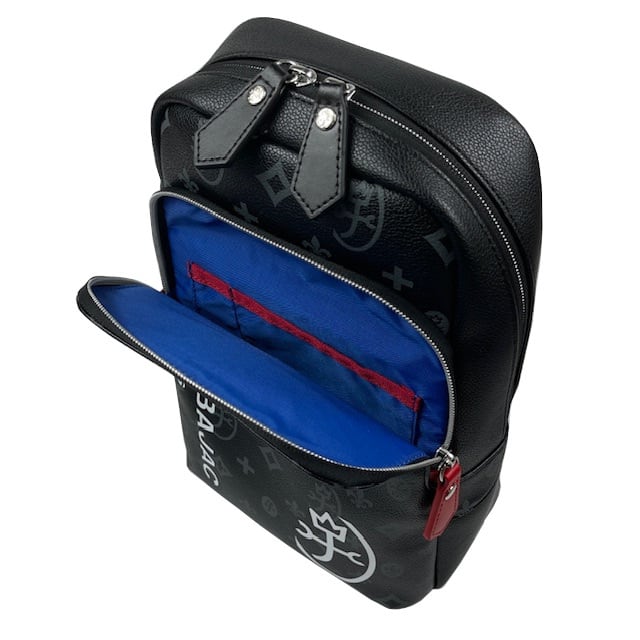 シボ感ある合成皮革にCASTELBAJACオリジナルのモノグラムをプリントしたワンショルダーバッグ。
