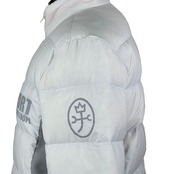 やや光沢を抑えたポリエステル素材にカステルバジャックのロゴデザインをのせた軽量ダウンブルゾン。